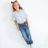 El Jean Maggie para niña combina estilo y comodidad en una prenda versátil para cualquier ocasión. Confeccionado en denim tejido plano 100% algodón, ofrece suavidad, frescura y resistencia para acompañar cada aventura. 💙