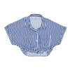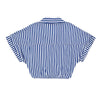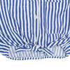 El diseño incluye detalle de anudado en el frente, aportando un toque juvenil y actual. Además, cuenta con almilla y bolsillos, combinando funcionalidad y estilo. Su color de rayas azul le da un aire delicado y femenino, perfecto para combinar con jeans, faldas o shorts en cualquier ocasión.